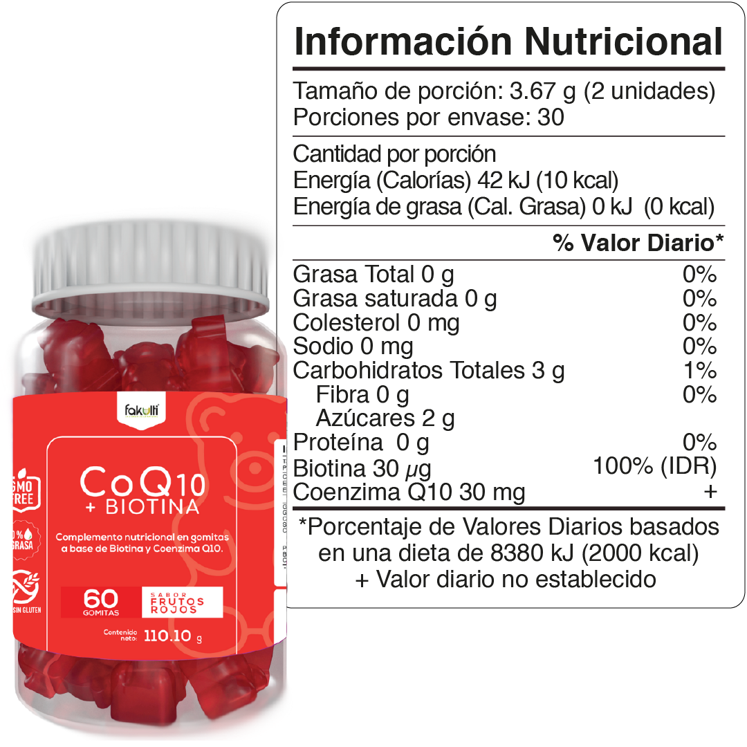 Dale a tu cuerpo el cuidado que necesita con las gomitas CoQ10 + Biotina de Fakulti. Este suplemento combina los beneficios de la biotina y la coenzima Q10 en un delicioso formato con sabor a frutos rojos, ideal para mejorar tu vitalidad, cuidar tu cabello y piel, y proteger tus células del envejecimiento.