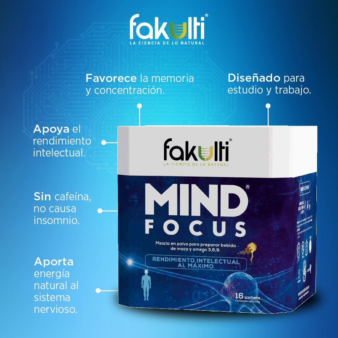 Descubre Mind Focus, el suplemento revolucionario de Fakulti que combina maca y omegas 3, 6 y 9 para mejorar tu memoria, concentración y rendimiento intelectual de manera natural.